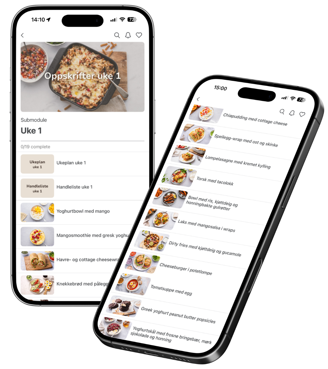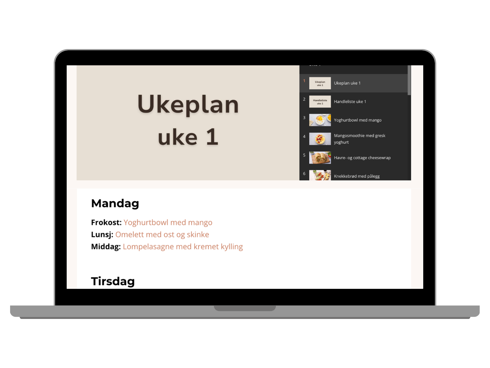 Ferdige ukeplaner med frokost, lunsj, middag og snacks â basert pĂ„ vanlige rĂ„varer.